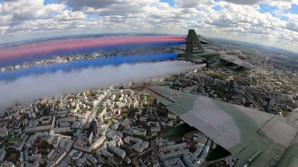 Завершил Парад Победы пролет авиации: в небе над Красной площадью прошел ромб из самолётов Су-30 и МиГ-29 пилотажных групп «Русские витязи» и «Стрижи», а замыкали парадный строй штурмовики Су-25, по традиции раскрасившие небо в цвета российского флага.