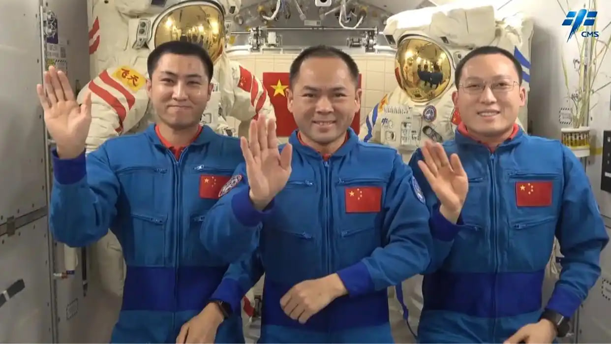Перед музыкальной частью экипаж «Шэньчжоу-21» поделился своими размышлениями о национальном флаге.