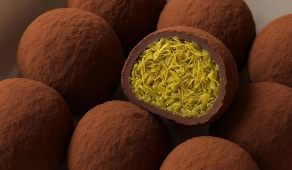 Это жевательное печенье – южнокорейское переосмысление дубайского шоколада. Когда спрос на трендовый десерт стал падать, местные кулинары решили дать ему вторую жизнь: заменили шоколад на шоколадное маршмэллоу и немного поменяли начинку, сделав её более нежной, но оставив такой же хрустящей.