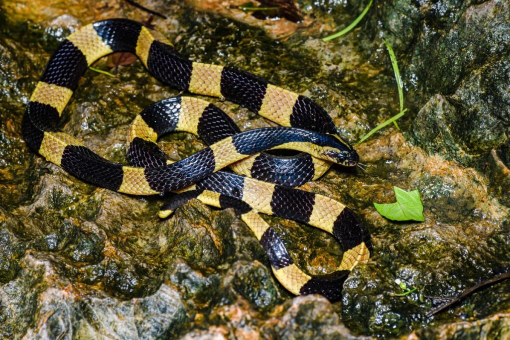 Черно-желтый полосатый узор, опоясывающий треугольное тело, не даст спутать крайта с другими видами. Яркая рептилия обитает в лесах и на сельскохозяйственных угодьях, часто занимает термитники и норы грызунов. Обычно робкие и неагрессивные в дневное время, ленточные крайты становятся куда более активными с наступлением темноты.